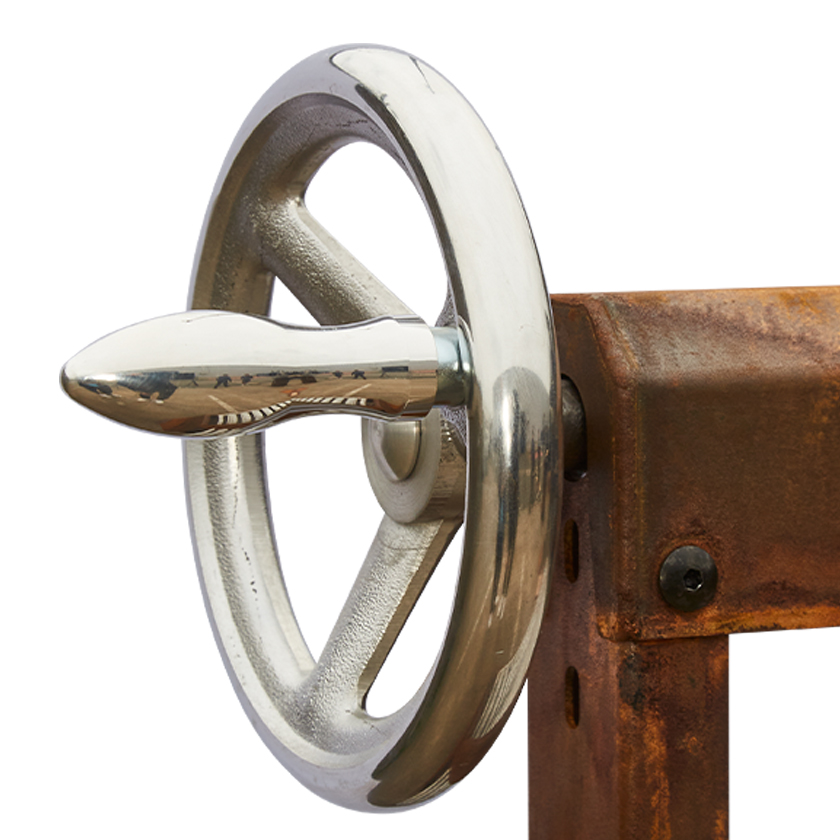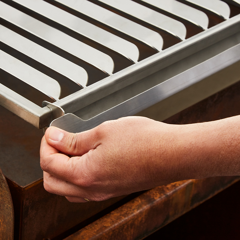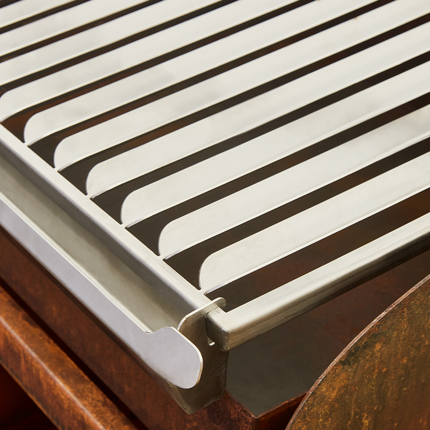 All-metal construction: Corten steel and stainless-steel grates.Crank handle for height adjustment.Easy cleaning with ash drawer.Easy transport or removal on castors.
